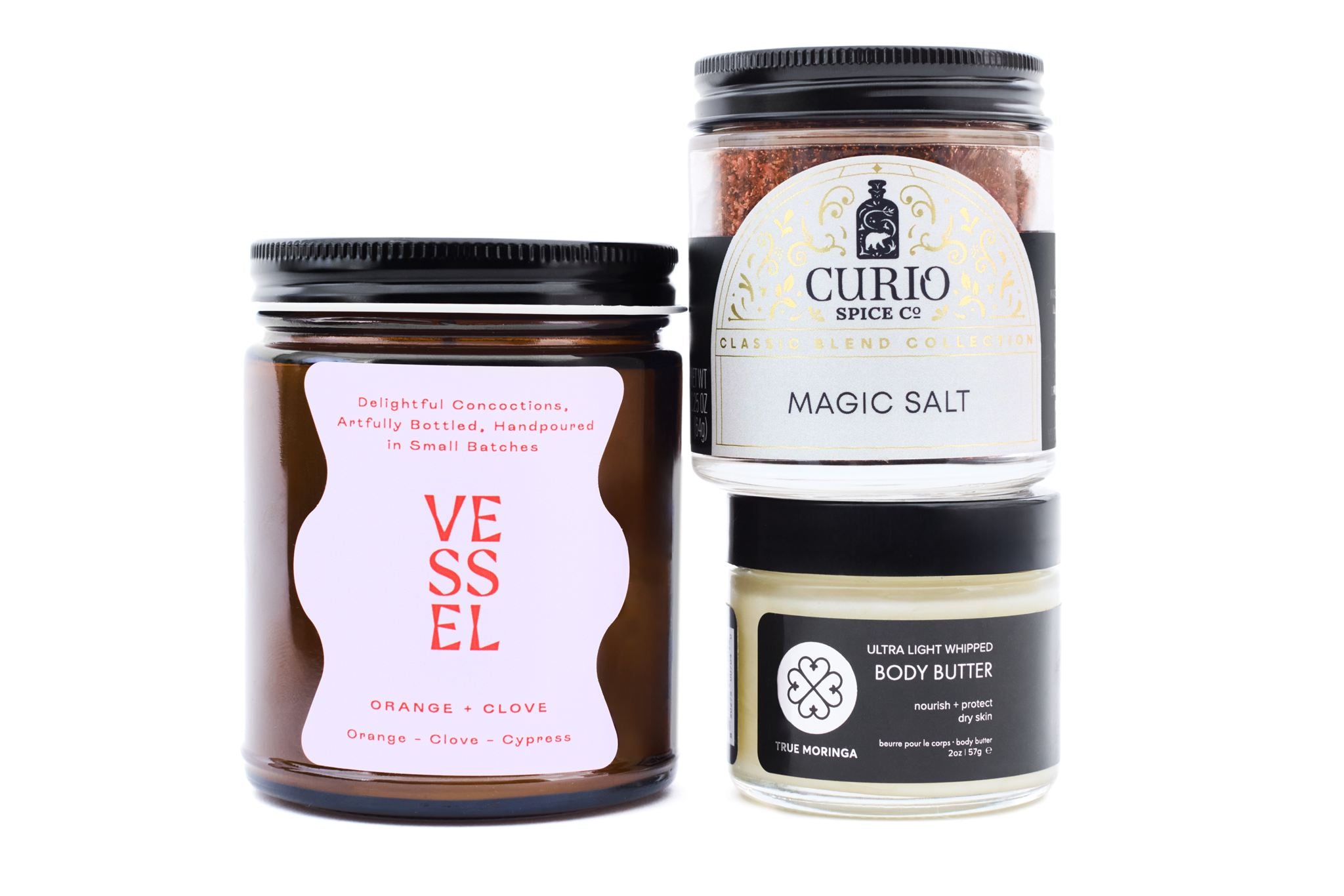 Three Boston-based, woman-owned brands - Curio Spice Co, Vessel Candle Co, & True Moringa - have teamed up to bring you a bundle of treats that set the mood for a magical holiday season. Expertly crafted with the purest natural ingredients from around the globe, each box plants a tree in your name.